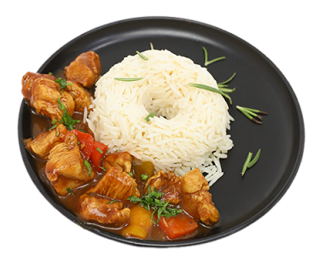 قطع دجاج مشوية بإتقان، مغطاة بصوص الباربيكيو المدخن، تُقدَّم بجانب أرز أبيض – وجبة متكاملة تجمع بين الطراوة والمذاق القوي لعشاق النكهات المميزة
